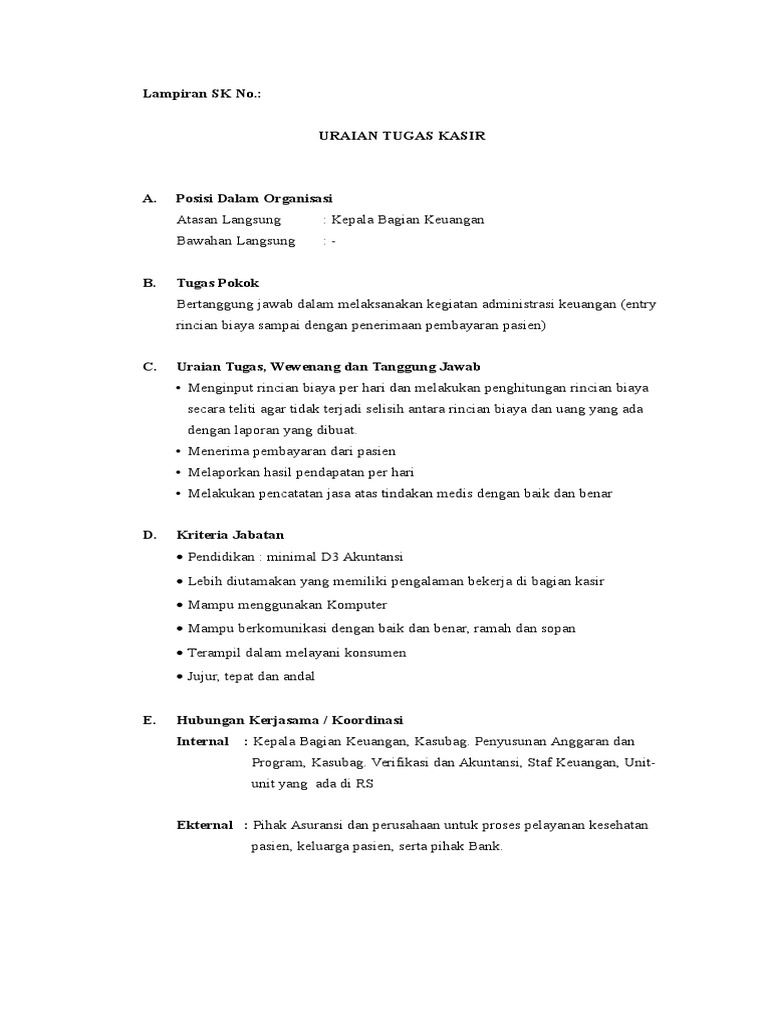 Yusuf uraian tugas tanggung jawab utamauraian tugas. Tapi, secara sederhana intinya begini. .tangan kasir diperlukan sebagai tanda sah suatu dokumen transaksi pada lembaga keuangan, pada umumnya kasir bekerja di belakang gerai (counter), pada bank besar telah ditetapkan tugas. Direktur keuangan bertugas untuk mengawasi seluruh operasional keuangan yang ada di perusahaan pada bagian ini terdiri dari acounting, cmt dan kasir. Kasir general juga memiliki tugas untuk mengelola keuangan asing maupun lokal.